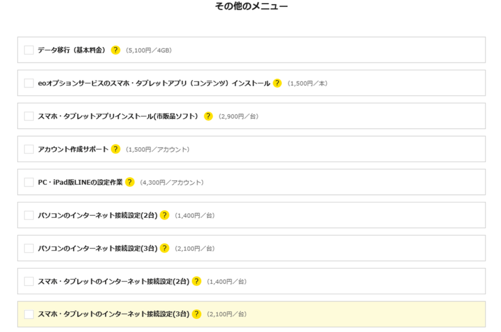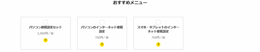 | パソコン初期設定 | パソコンのインターネット接続設定 | パソコンのインターネット接続設定 (SSID確認、パスワードの入力、インターネット接続確認、有線接続含む) | パソコン1台ごと | 700円 |